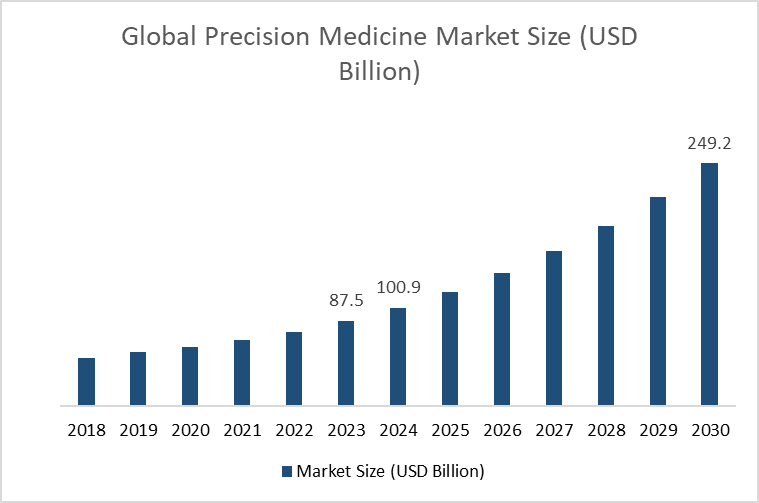 Due to the rise in adoption of this technology, the demand for precision medicine has increased globally, and is expected to reach USD 249.24 billion by 2030 with a 16.3% CAGR from 2024 to 2030.