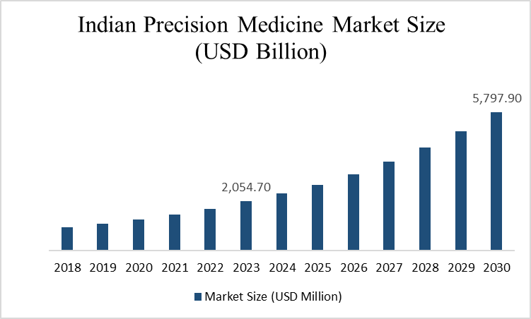The Indian market size of precision medicine in the healthcare industry was recorded at USD 2,054.7 million in 2023 and is expected to reach USD 5,797.9 million between 2024 and 2030 with a 16% CAGR.
